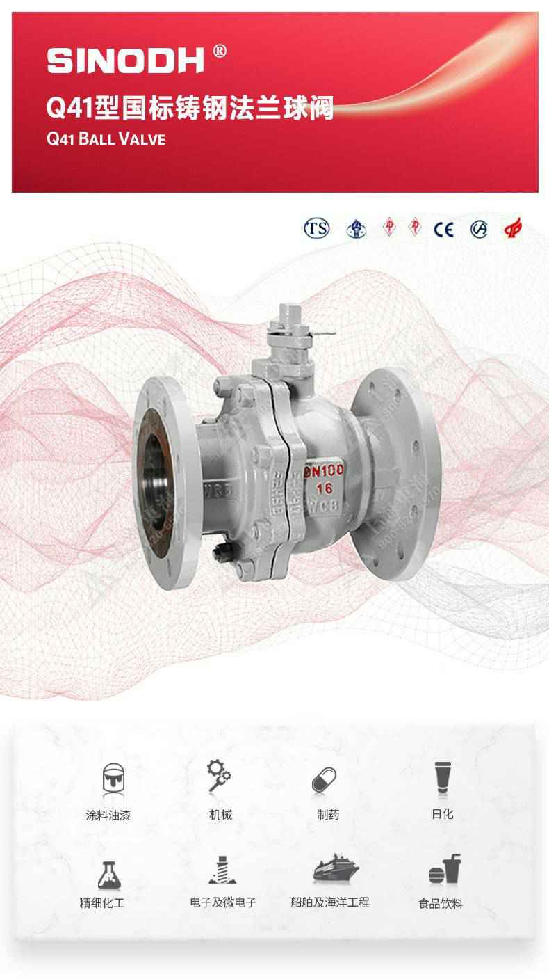 Q41型国标铸钢法兰球阀,为金沙澳门(中国)唯一官方网站自主研发生产。本产品设计制造标准符合GB/T12237、GB/T12224标准。该产品的球体在介质压力作用下球体能产生一定的位移并紧压在出口端的密封面上,保证出口端密封。适用于水、溶剂、酸和天然气等一般工业介质也适用于工况恶劣的介质,如氧气、过氧化氢、甲烷和乙烯等介质。